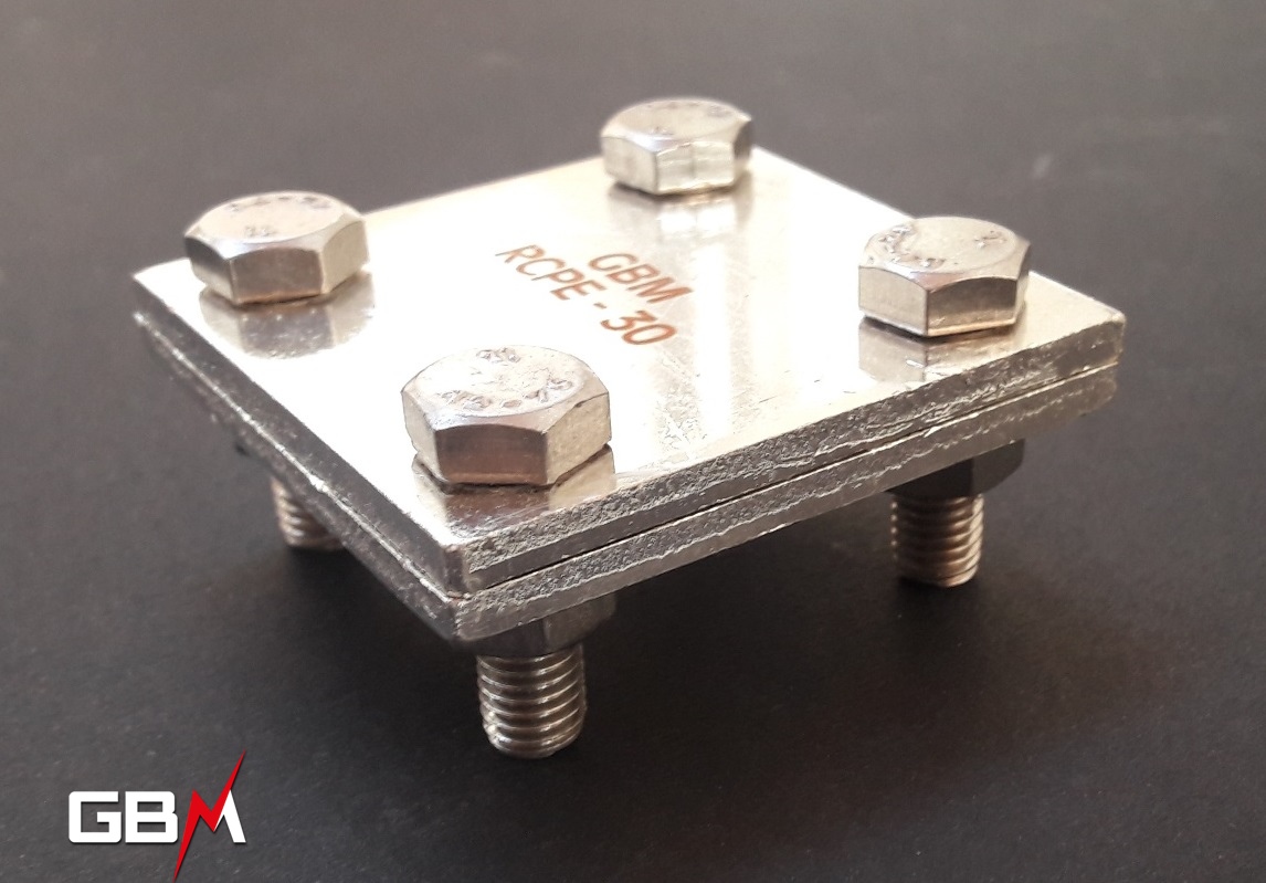 Raccord de croisement plat/plat en cuivre étamé avec visserie Inox pour méplat de 30 mm. Le raccord de croisement peut être enterré. Afin de protéger la liaison vous pouvez ajouter de la bande anticorrosion.