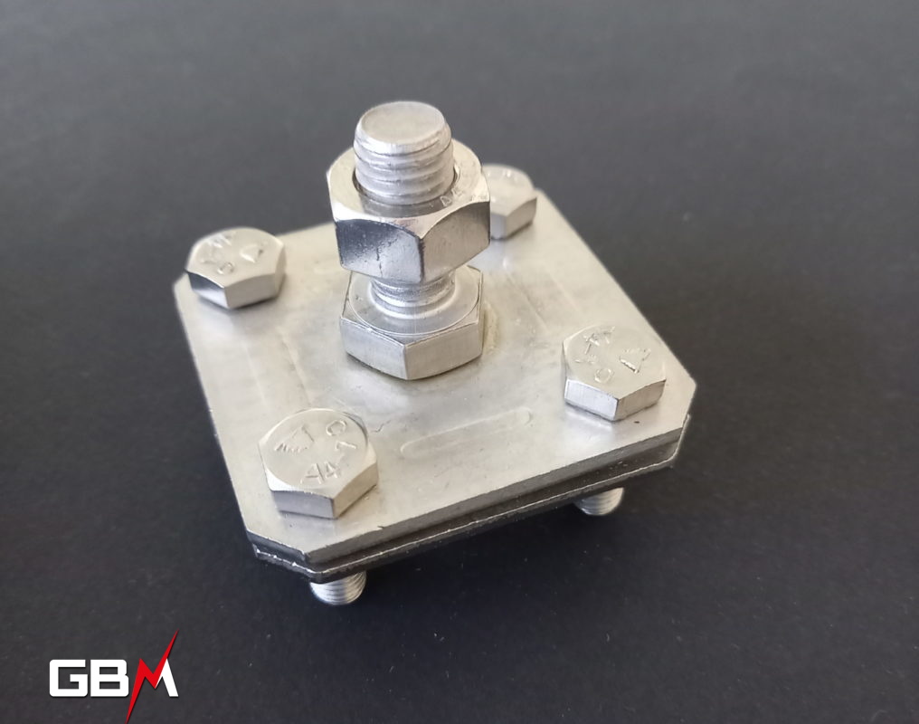 Raccord de croisement en Inox A4 (AISI 316), dimensions 60x60mm, visserie Inox M8x25 pour passage d’un méplat de largeur 30mm et/ou rond de diamètre 8-10mm. Goujon central M12 pour montage d’une prise de terre ou pointe captrice.